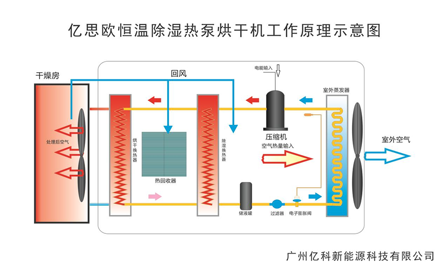 熱泵烘干機(jī)是利用逆卡諾原理,吸收空氣的熱量并將其轉(zhuǎn)到庫房內(nèi),實(shí)現(xiàn)烘干房的溫度提高,配合相應(yīng)的設(shè)備實(shí)現(xiàn)物料干燥。熱泵烘干機(jī)由壓縮機(jī)——換熱器(內(nèi)機(jī))——節(jié)流器——吸熱器(外機(jī))——升壓升溫過程(溫度高達(dá)100℃),它進(jìn)入內(nèi)機(jī)釋放出高溫?zé)崃考訜岷娓煞績?nèi)空氣,同時被冷卻并轉(zhuǎn)化為流液態(tài),當(dāng)它運(yùn)行到外機(jī)后,液態(tài)迅速吸熱蒸發(fā)再次轉(zhuǎn)化為氣態(tài),同時溫度下降至零下20℃-30℃,這時吸熱器周邊空氣就會源源不斷地將熱量傳遞給冷媒。冷媒不斷地循環(huán)就實(shí)現(xiàn)將空氣中的熱量搬運(yùn)到烘干房內(nèi)加熱房內(nèi)空氣溫度。