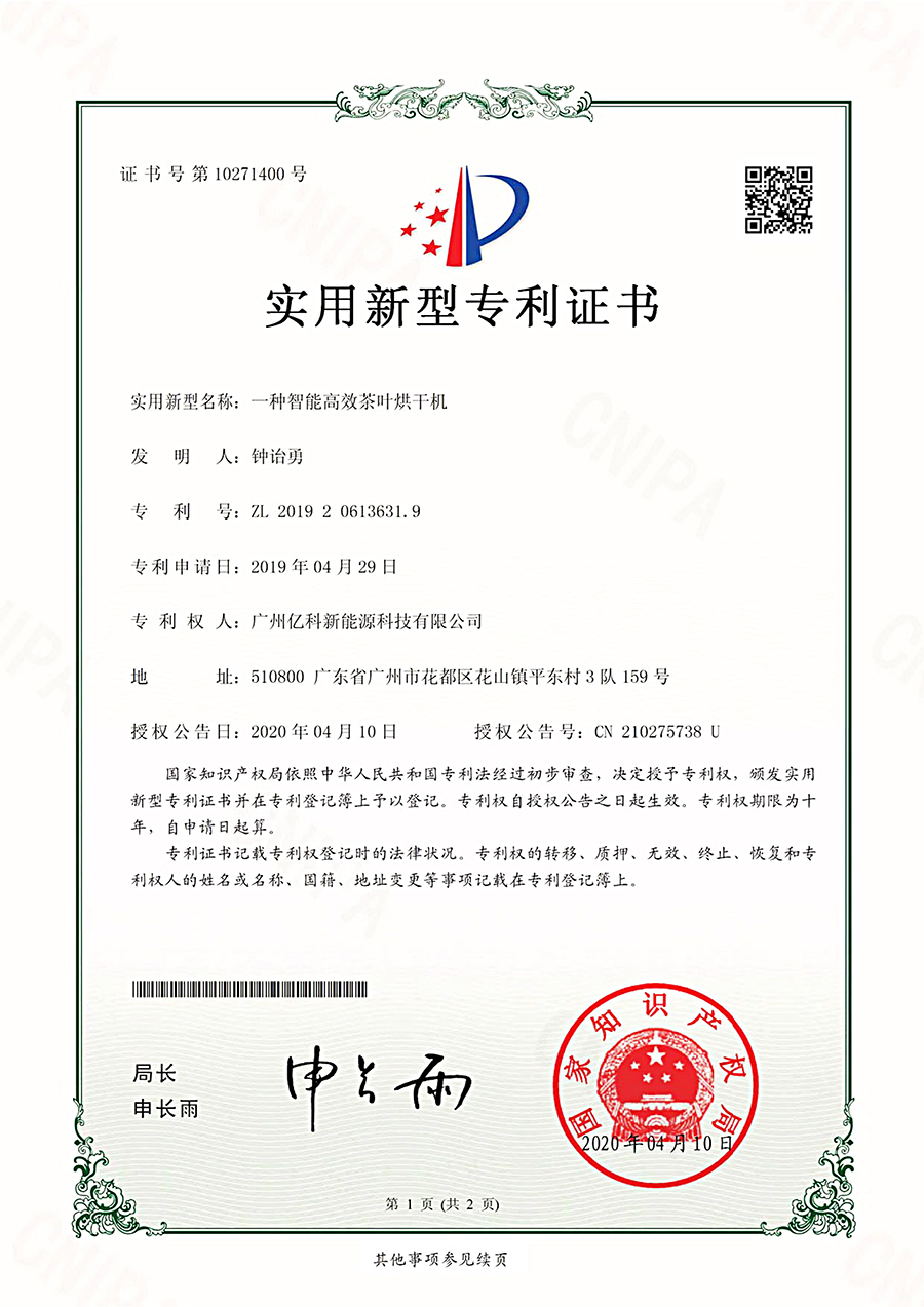 2019年獲得一種智能高效茶葉烘干機實用新型專利證書