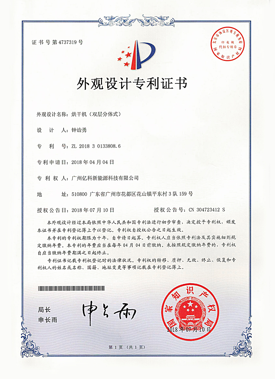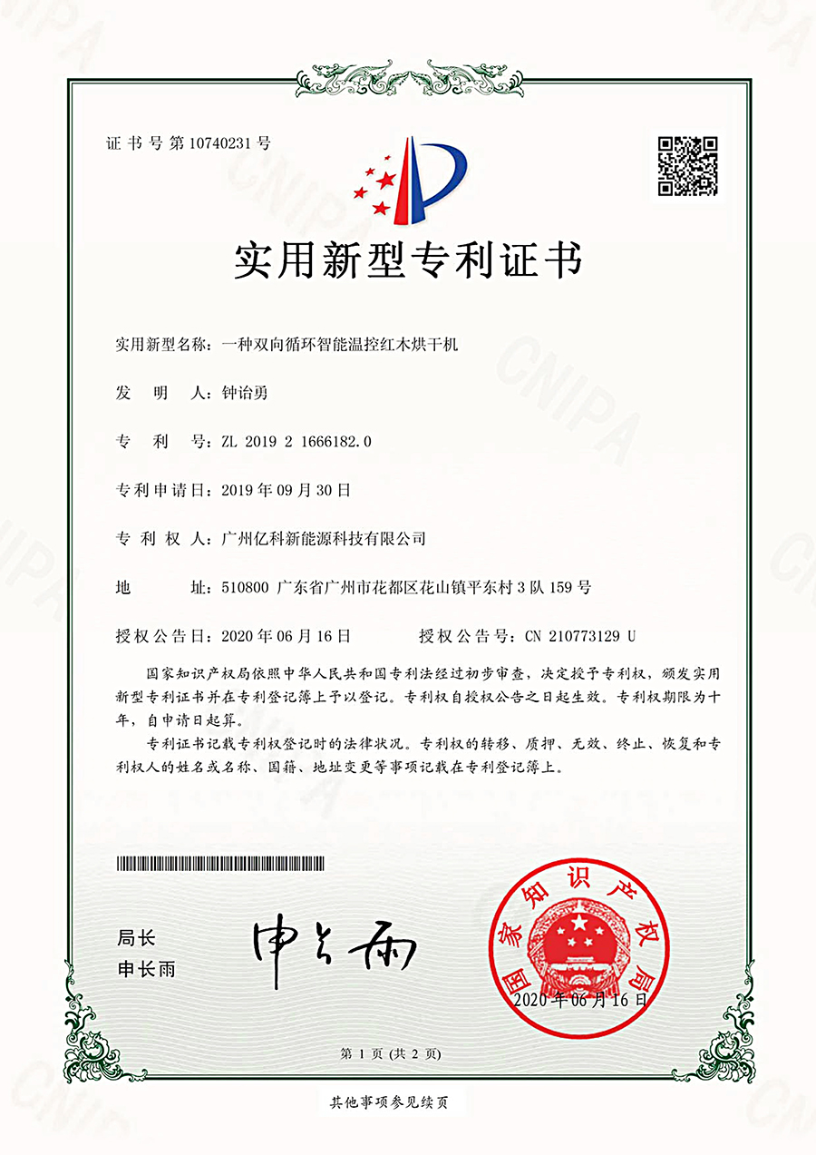 2019年獲得一種雙向循環(huán)智能溫控紅木烘干機實用型新型專利