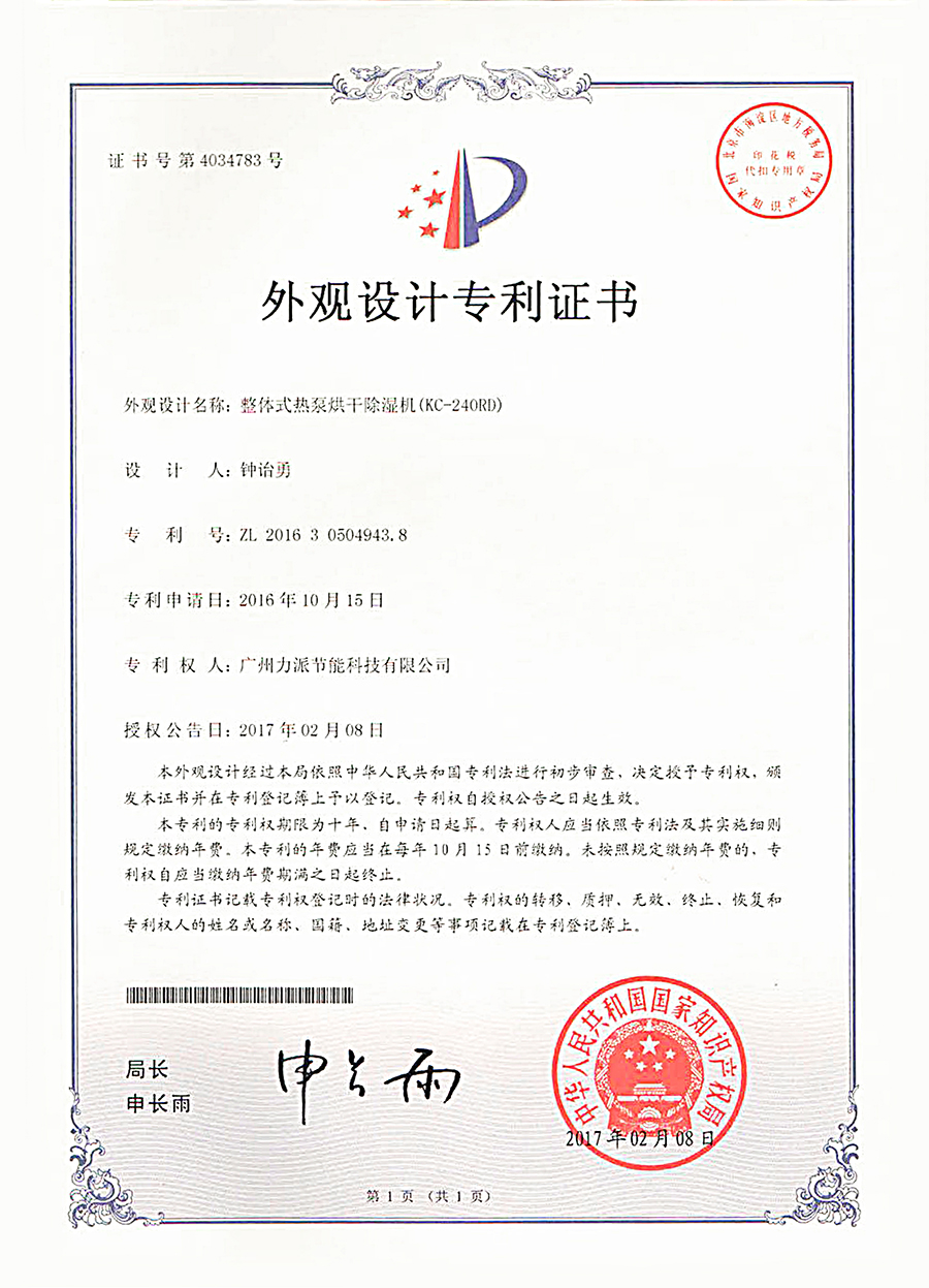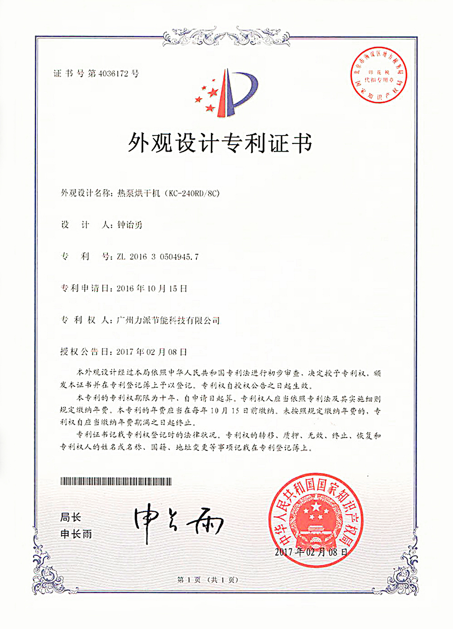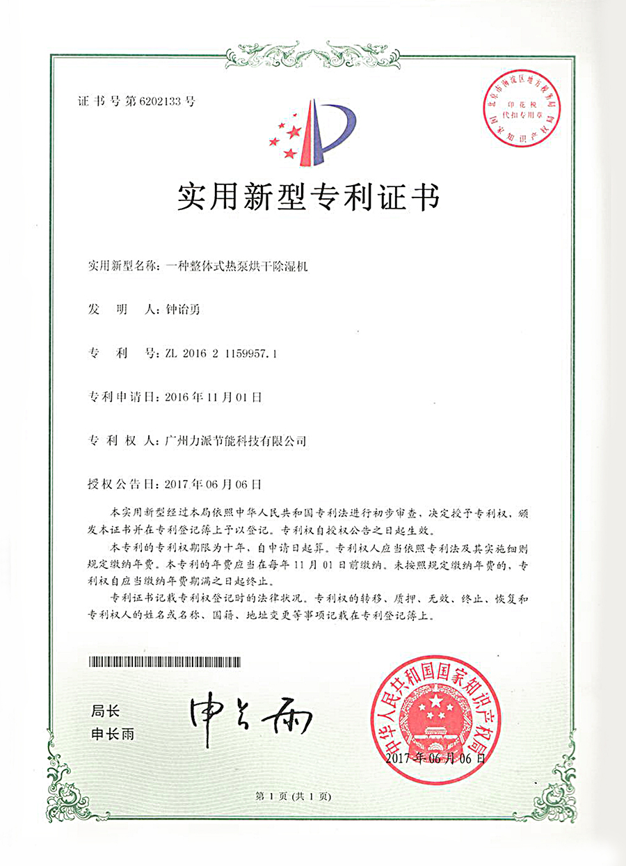 2016年獲得整體式熱泵烘干除濕機實用型新型專利