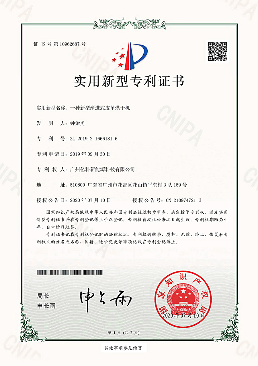 2019年獲得新型漸進式皮革烘干機實用型新型專利證書