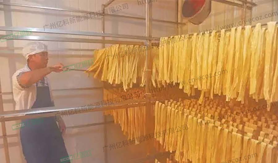 最開始烘干的方法是用柴火熱氣干燥,衛(wèi)生很差,火候控制也不好,良品率不高、人工多。后來改用鍋爐蒸汽供熱干燥,能耗太大不說,而且還要專門安排人加班看守鍋爐,有時供汽不足,也會讓腐竹的干燥效果不好。