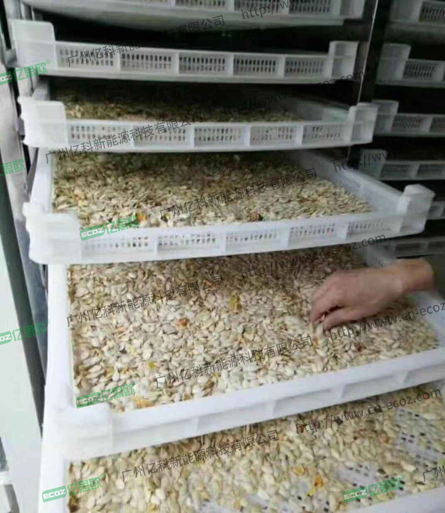 先將煮出的100千克瓜子,趁熱拌入5千克食鹽和2千克白糖,攪拌均勻。取潔凈的托盤,將瓜子均勻地撒在上面,每算的瓜子約1千克。將裝有瓜子的托盤送入烤房,排列在烤架上。