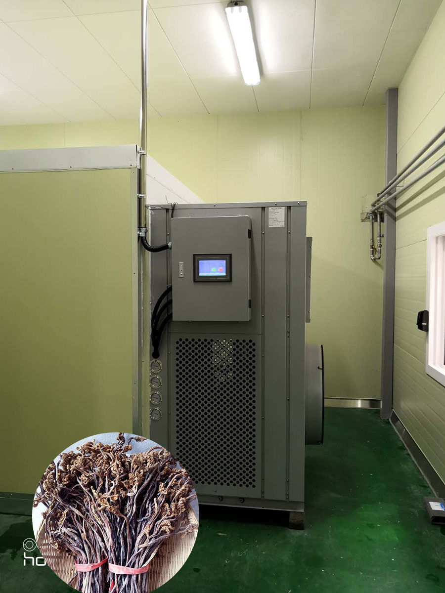 蕨菜烘干可以分為4段完成,前期第一段設(shè)定1小時(shí),目標(biāo)溫度50℃,在環(huán)境溫度20℃時(shí),滿倉(cāng)的溫度上升是可以達(dá)到的,環(huán)境溫度過(guò)低時(shí),啟動(dòng)電加熱輔助。第二段3小時(shí),溫度升到55℃,連續(xù)排濕。第三段溫度升到60℃,時(shí)間4小時(shí),除濕到20%,最后一段2小時(shí),物料除濕到15%含水。