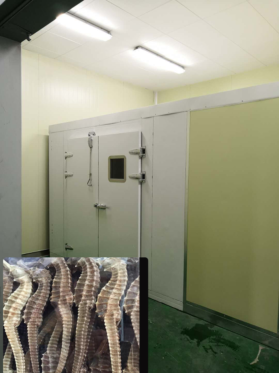 先將海馬打撈出進(jìn)行清洗,將清洗后的海馬放入50℃的溫淡鹽水中浸泡10min,可以保證海馬的色澤和外形,之后取出風(fēng)干直至海馬表面無明水,風(fēng)干后的海馬均勻地?cái)傇诤姹P上,再進(jìn)行烘干處理。最好不要鋪的太密,以免影響烘干效果,裝進(jìn)物料車,然后送入海馬烘干房。